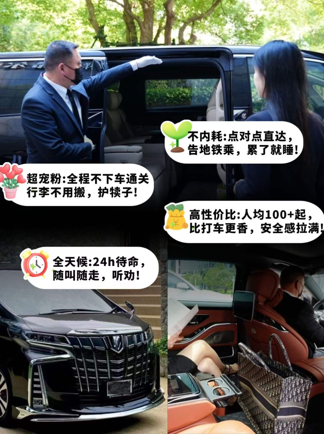 灵活便捷:支持24小时预订,商务车/面包车可选,满足家庭游、团建等不同需求。